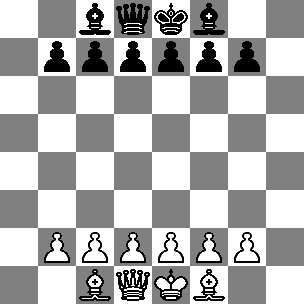 Thierry Le Gleuher has composed many of these problems, and has a different aesthetic, which is to attempt to achieve these positions with the maximum number of moves. This gets too close to "massacres" for my current tastes. All of these are verified by Natch or Euclide. I have kept a copy of the output file for the very time-consuming ones. See also the Pronkin & Ceriani-Frolkin analysis further down this page. {C01} 1. h4 g5 2. h�g5 Nf6 3. g�f6 Bg7 4. f�e7 Rf8 5. e�f8=B B�b2 6. Ba3 B�c1 7. B�c1.Minimal possible number of moves for B Pronkin, and smaller number of captures than {CP04}. (C+) {C02} 1. e4 d5 2. e�d5 Nc6 3. d�c6 Qd4 4. c�b7 Q�b2 5. b�a8=Q